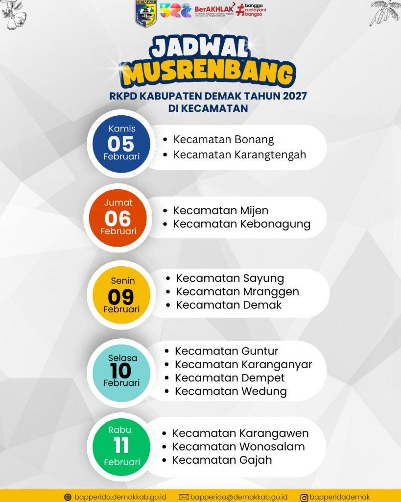 Musyawarah Perencanaan Pembangunan RKPD Kabupaten Demak Tahun 2027 tingkat kecamatan menjadi momentum penting dalam memastikan perencanaan pembangunan sesuai dengan kebutuhan masyarakat. Melalui forum ini, usulan pembangunan dari desa dan kelurahan dihimpun untuk dirumuskan menjadi prioritas pembangunan daerah. Musrenbang telah dilaksanakan di seluruh 14 kecamatan di Kabupaten Demak sebagai bentuk pengawalan usulan masyarakat desa dan kelurahan dalam perencanaan pembangunan.